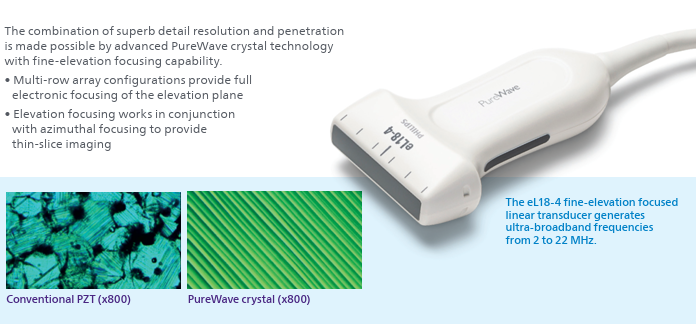 Νέα Linear κεφαλη eL18-4 PureWave Crystal με εύρος εκτεταμένης συχνότητας λειτουργίας 18 έως 4 MHz για επιφανειακές εφαρμογές υψηλής ανάλυσης, συμπεριλαμβανομένων των μικρών οργάνων, του μαστού, αγγειακής και μυοσκελετικήςαπεικόνισης.