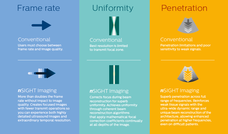 Η πρωτοποριακή αρχιτεκτονική nSIGHT Imaging σχεδιάσθηκε από την Philips για επαναστατικές 2D, Live xPlane, Live Volume imaging/Live 3D Echo, 3D/4D (υβριδικής και πλήρως ηλεκτρονικής σάρωσης), MPR και πανοραμικές απεικονίσεις: